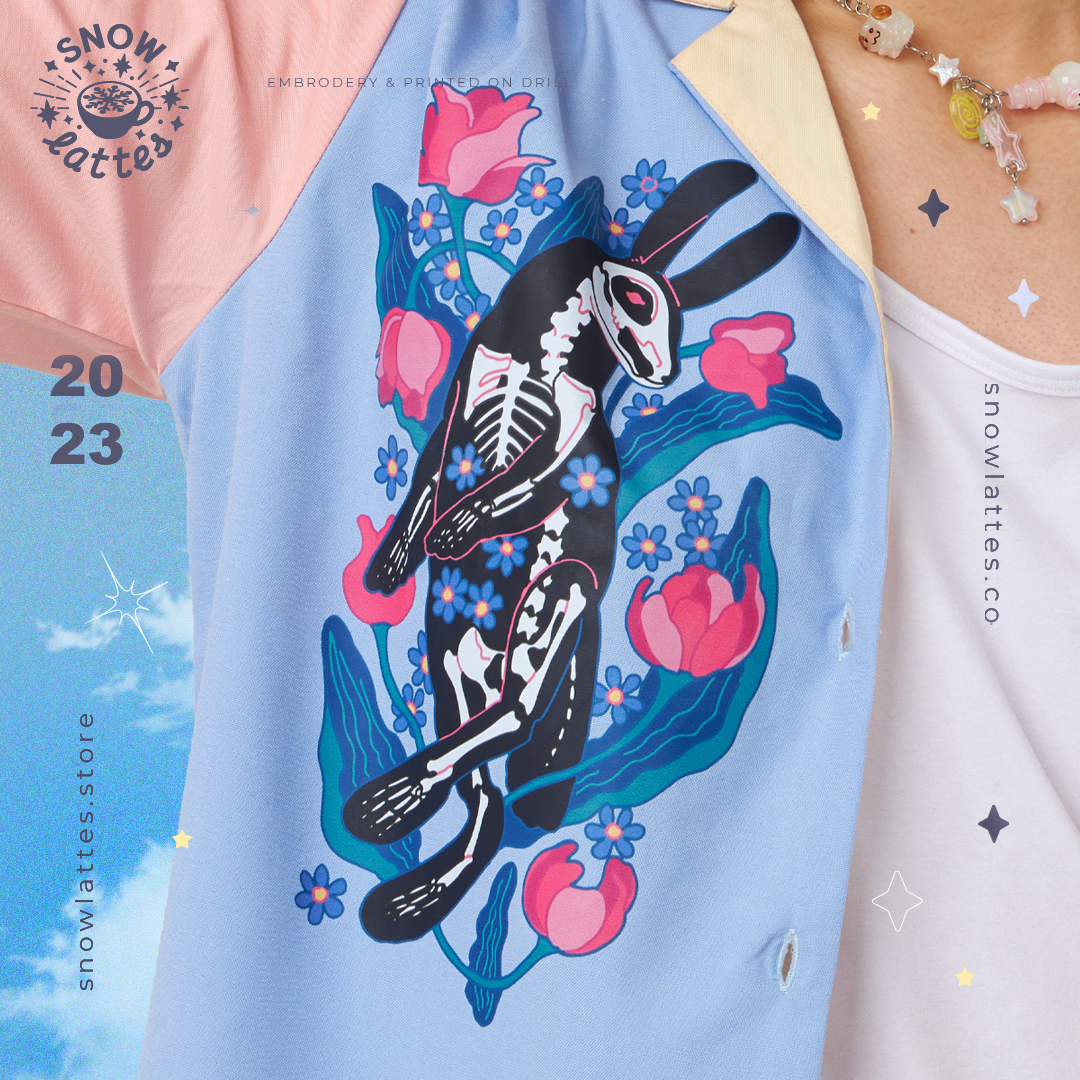 Spring blooms from within.. A brand new Snowlattes collection for this year’s spring! The Spring Bunny set is the first of our matching shirt and bottoms set series with cute intricate illustrations of bunnies by Snow. DTF printed and embroidered on drill.
