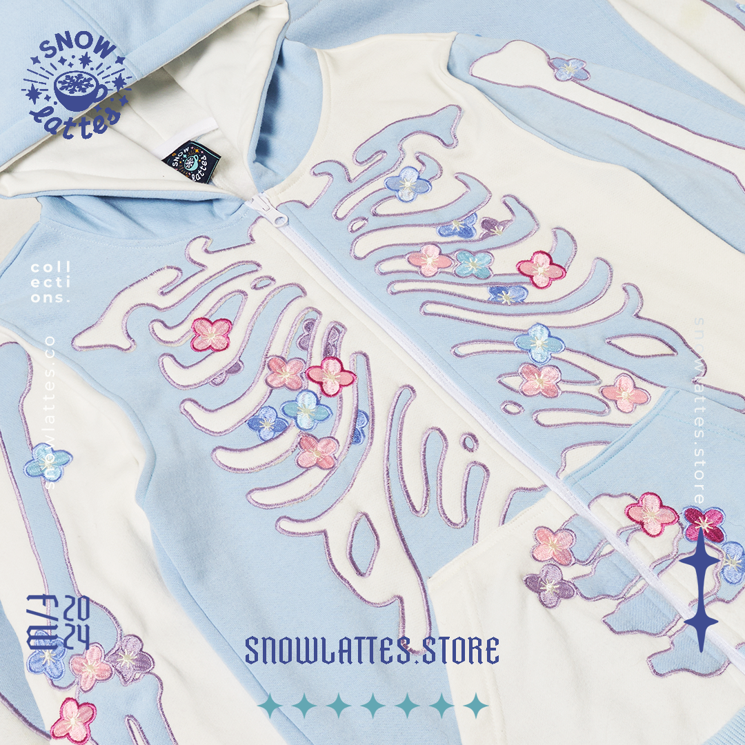 Skeletal System Hydrangea is available in 1 color only — Blue/White. Printed and embroidered on cotton fleece. The jackets range from S-5XL. Please make sure to check our Size Guide on the site.